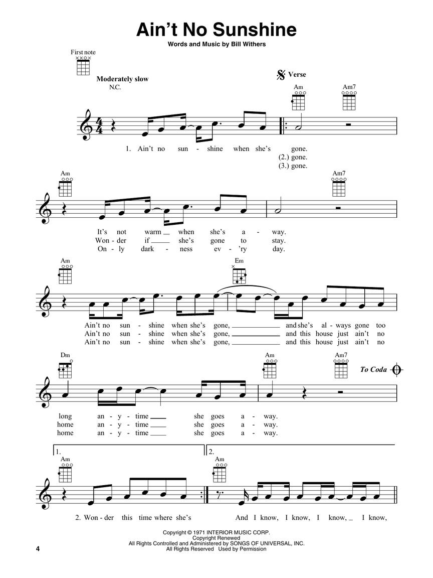 If you're new to the ukulele, you're probably eager to learn some songs! This book features favorites in standard G-C-E-A tuning with melody, lyrics, and chord diagrams that beginning players want to strum and sing. Songs include: Ain't No Sunshine • All You Need Is Love • California Dreamin' • Demons • Drift Away • Have You Ever Seen the Rain? • Knockin' on Heaven's Door • Last Kiss • Margaritaville • My Girl • Perfect • The Sound of Silence • Wake Me Up • When Will I Be Loved • and more.
