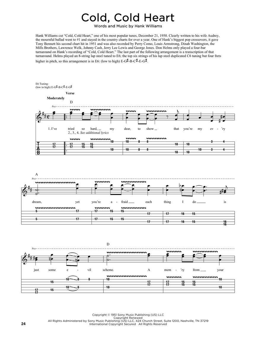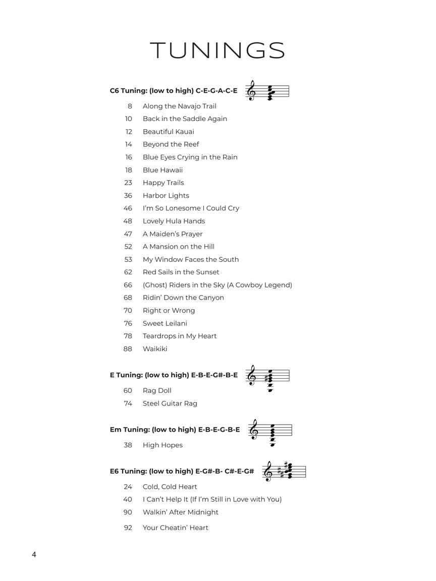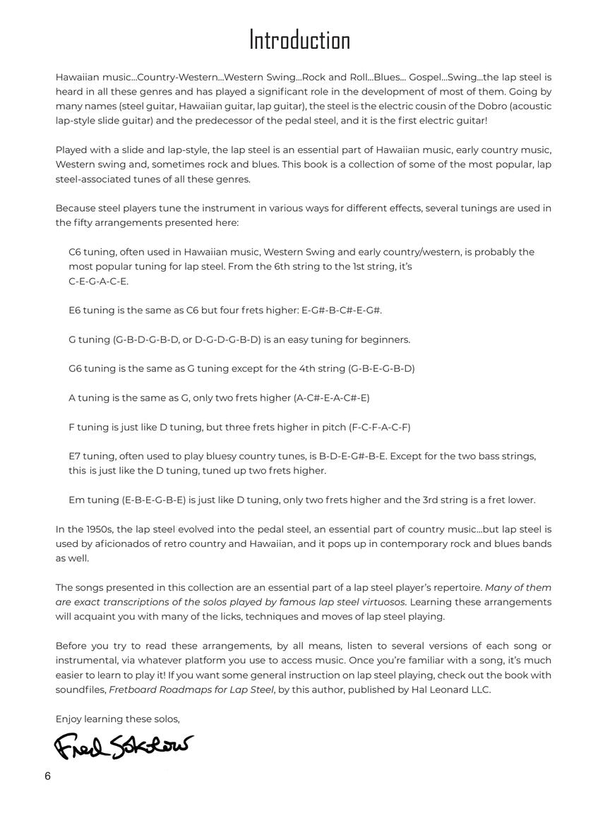 This one-of-a-kind collection arranged by Fred Sokolow features accessible, must-know songs for anyone ready to start playing lap steel guitar, or any player wanting to expand their repertoire. Each song is presented in a combination of tab, standard notation, chords, and lyrics for the most popular songs lap steel players like to play. This collection features songs in several tunings, including open G, open E and C6, in these genres: country, Hawaiian, Western swing, rock/pop, folk, and blues. It also includes many transcriptions of solos by famous steel players.
