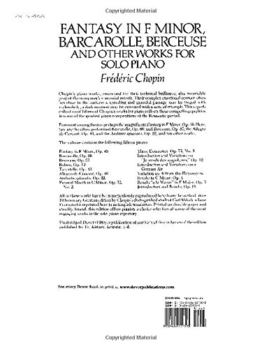 Chopin piano works, renowned for their technical brilliance, also invariably project the composer's mercurial moods. Their complex emotional content often lies close to the surface: a sparkling and graceful passage may be tinged with melancholy, a dark moment may be crowned with a note of triumph. This superb collection of fifteen of Chopin's works for piano reflects these compelling qualities in some of the greatest piano compositions of the Romantic period. Foremost among them is perhaps the magnificent Fantasy in F Minor, Op. 49. Here, too, are the often-performed Barcarolle, Op. 60, and Berceuse, Op. 57; the Allegro de Concert, Op. 46, and the Andante spianato, Op. 22; and ten other works. The volume contains the following fifteen pieces: Fantasy in F Minor, Op. 49; Barcarolle, Op. 60; Berceuse, Op. 57; Bolero, Op. 19; Tarantelle, Op. 43; Allegro de Concert, Op. 46; Andante spianato, Op. 22; Funeral march in C Minor, Op. 72, No. 2; Three Ecossaises, Op. 72, No. 3; Introduction and variations on "Je vends des scapulaires," Op. 12; Introduction and Variations on a German Air; Variation No. 6 from the Hexameron; Rondo in C Minor, Op. 1; Rondo "à la Mazur" in F Major, Op. 5; and Introduction and Rondo, Op. 16. All of these works have been meticulously reproduced here from the authoritative 19th-century German edition by Chopin's distinguished student Carl Mikuli, whose Foreword is reprinted here in an English translation. Printed on durable paper and sturdily bound, this edition offers pianists a choice selection of some of the most engaging works in the solo piano repertory.