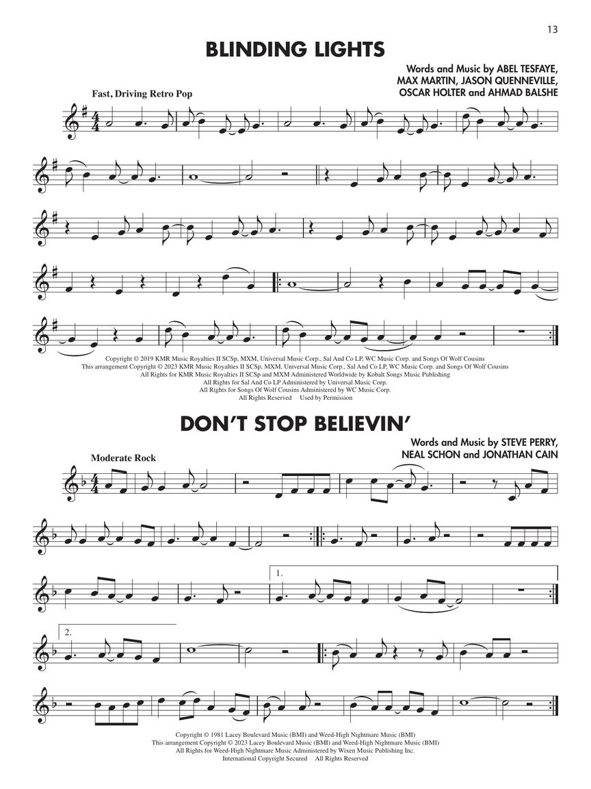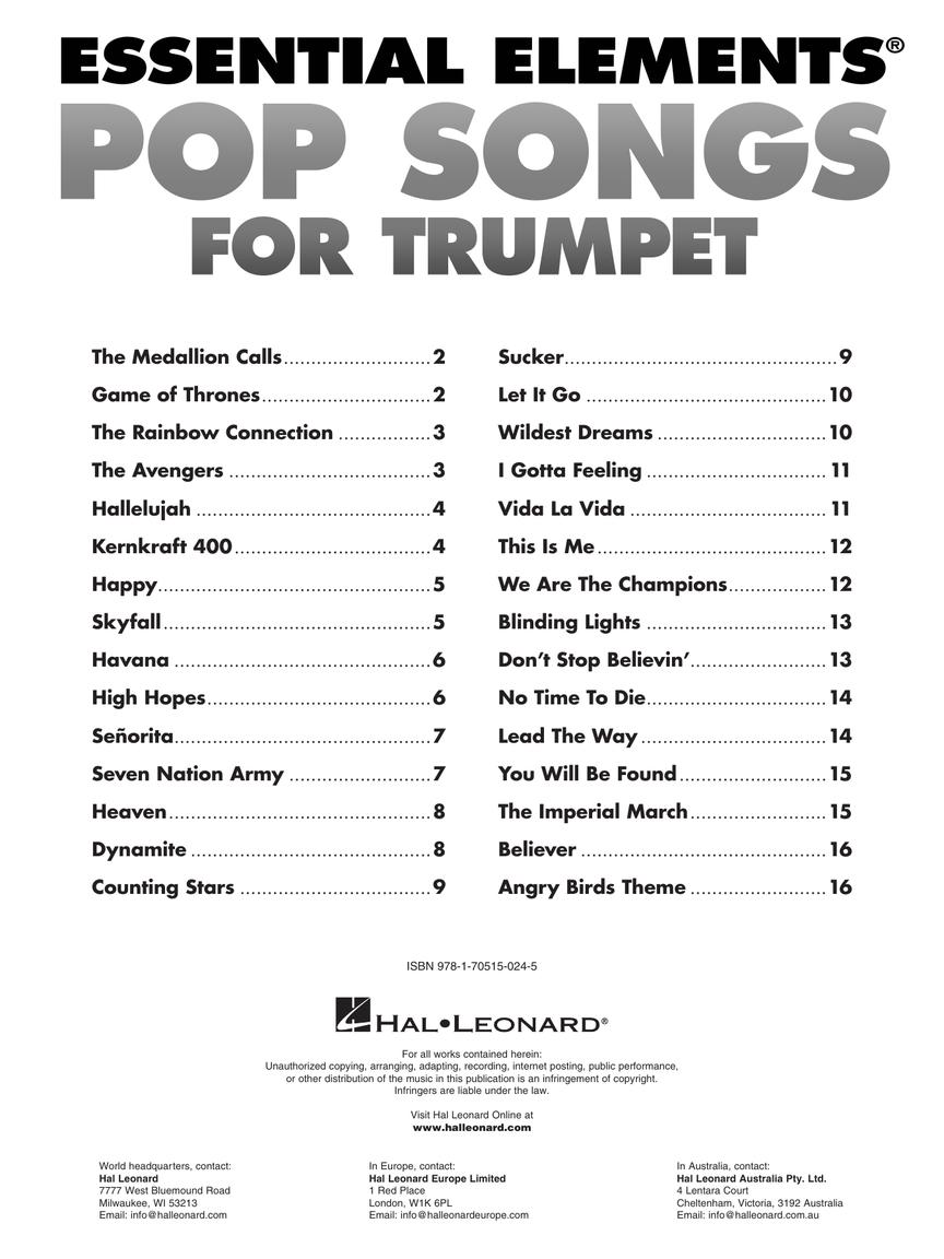 30 popular melodies at an easy level in solo books for all the instruments in the Essential Elements Band Method. Perfect motivational music for students to play and practice featuring songs by Billie Eilish, Queen, Shawn Mendes, Taylor Swift, Star Wars, The Avengers, and more! Titles include: Believer • Blinding Lights • Don't Stop Believin' • Dynamite • Hallelujah • The Imperial March (Darth Vader's Theme) • Let It Go • Señorita • Seven Nation Army • Sucker • This Is Me • We Are the Champions • Wildest Dreams • You Will Be Found • and more.