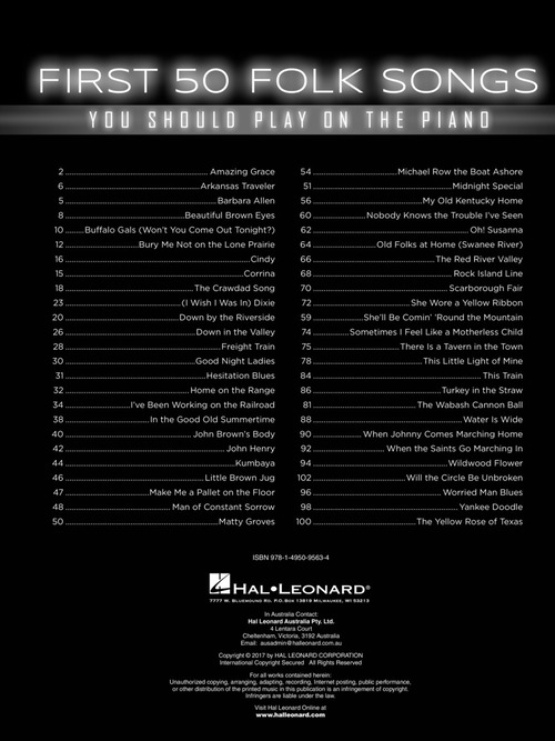 Arranjos facilitados para piano de 50 grandes sucessos da música folk; Amazing Grace • Buffalo Gals (Won't You Come Out Tonight?) • Down by the Riverside • Good Night Ladies • Home on the Range • I've Been Working on the Railroad • Kumbaya • Man of Constant Sorrow • Michael Row the Boat Ashore • My Old Kentucky Home • Nobody Knows the Trouble I've Seen • Oh! Susanna • The Red River Valley • Scarborough Fair • She'll Be Comin' 'Round the Mountain • This Little Light of Mine • Turkey in the Straw • The Wabash Cannon Ball • When the Saints Go Marching In • Yankee Doodle • The Yellow Rose of Texas • e outras!!!
