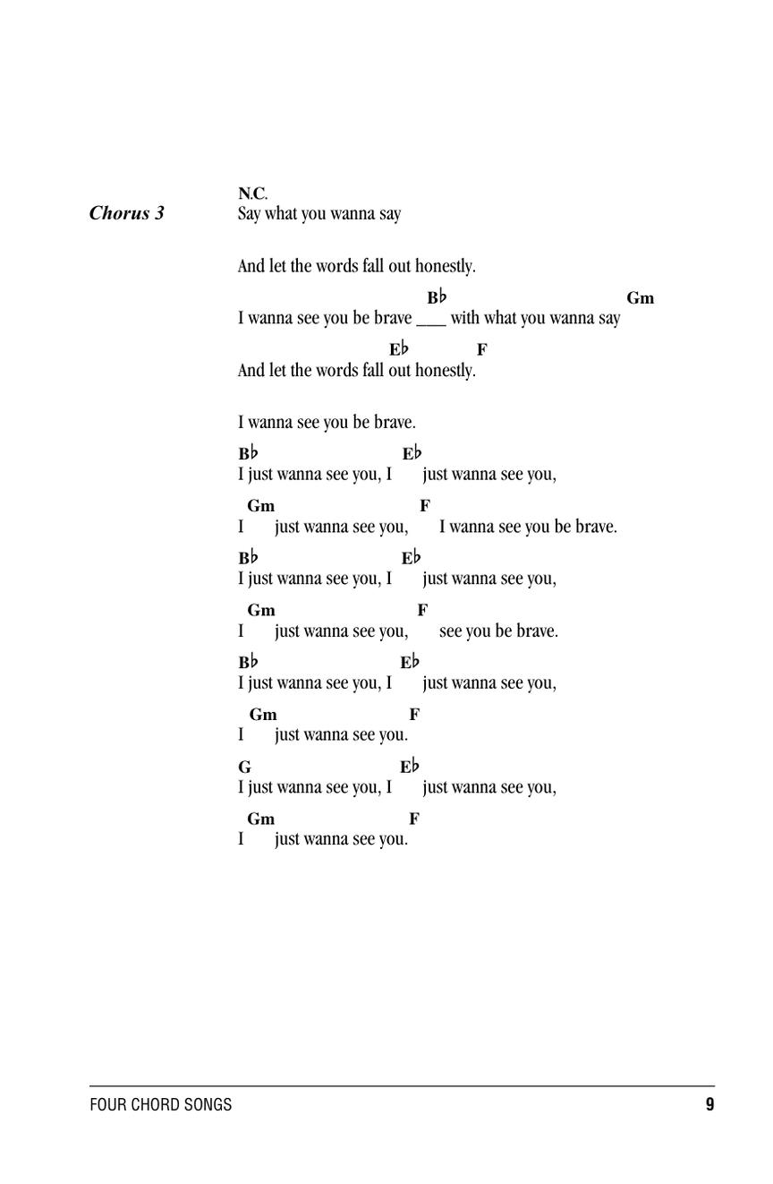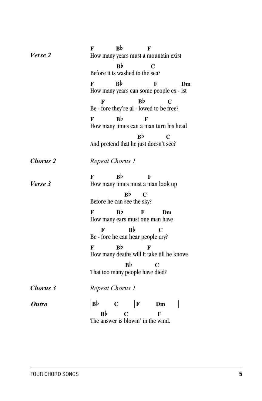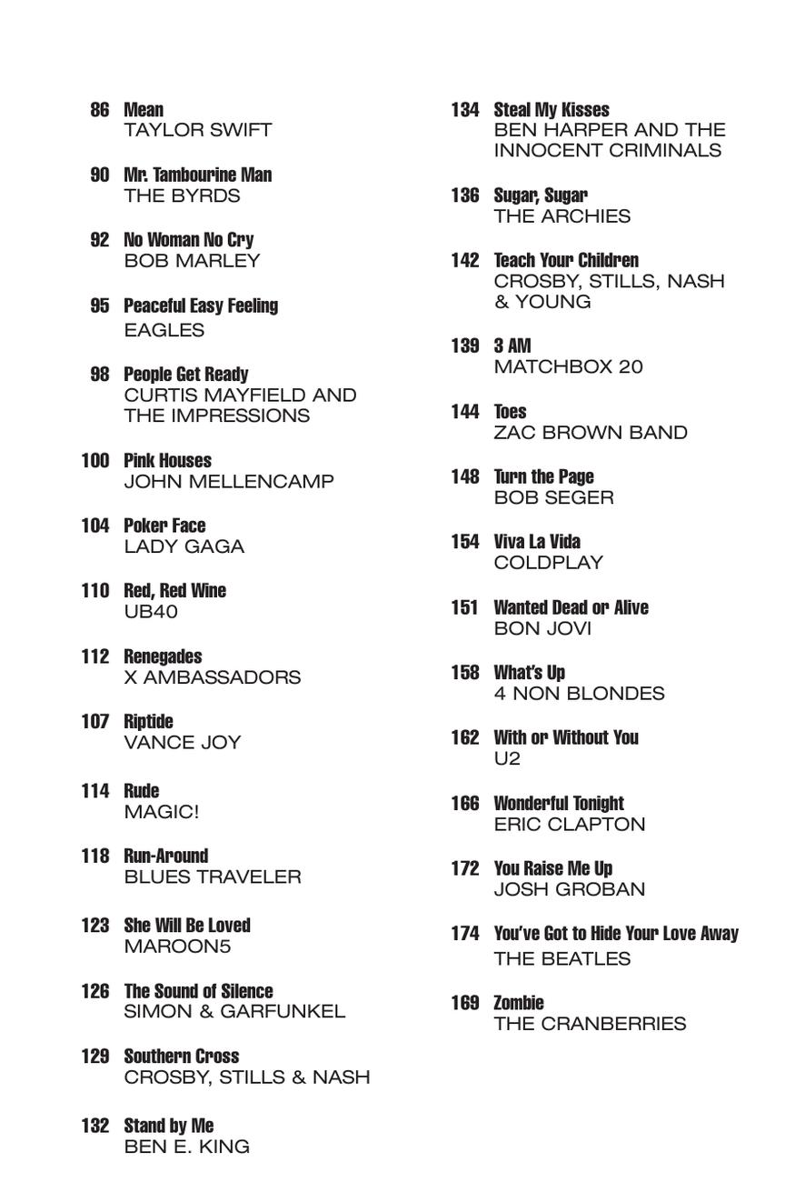 This easy collection features 60 songs you can play with just four chords: Brave • Careless Whisper • Cecilia • Drift Away • Every Rose Has Its Thorn • Fields of Gold • Good Riddance (Time of Your Life) • Hey, Soul Sister • Ho Hey • Last Kiss • Let It Be • Mean • Peaceful Easy Feeling • Renegades • Stand by Me • Teach Your Children • Toes • Viva La Vida • What's Up • Zombie • and many more.