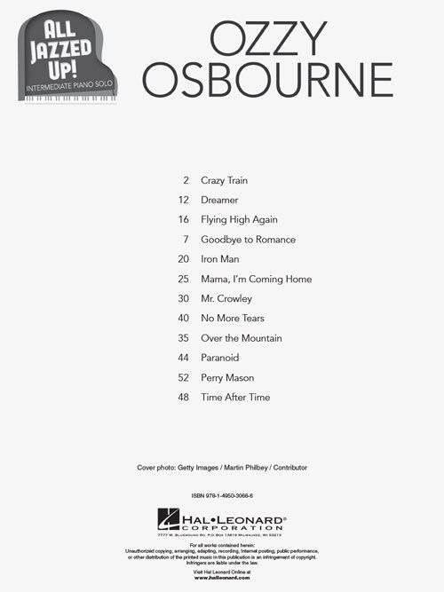 In this series, pop hits receive unexpected fresh treatments. Uniquely reimagined and crafted for intermediate piano solo, these favorites have been All Jazzed Up! Play 12 favorites from the Prince of Darkness: Crazy Train • Dreamer • Flying High Again • Goodbye to Romance • Iron Man • Mama, I'm Coming Home • Mr. Crowley • No More Tears • Over the Mountain • Paranoid • Perry Mason • Time After Time.