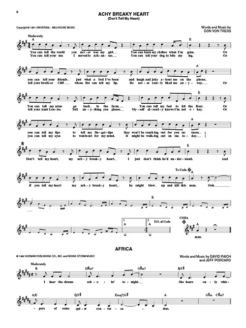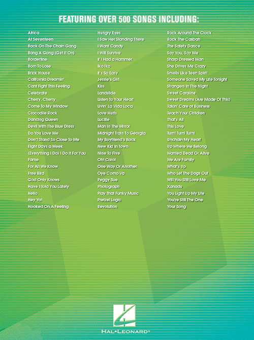 An indispensable collection of over 500 chart hits, including: Africa • Ain't No Sunshine • All I Need Is a Miracle • At Seventeen • Back on the Chain Gang • Bad Case of Loving You • Bang a Gong (Get It On) • Billy, Don't Be a Hero • Blue Eyes Crying in the Rain • Brick House • California Dreamin' • Can't Fight This Feeling • Carry on Wayward Son • Celebrate • Crocodile Rock • Dancing Queen • Free Bird • Have I Told You Lately • Hey Ya! • Hot Blooded • I Saw Her Standing There • I Will Survive • Iko Iko • In the Air Tonight • Jessie's Girl • Kiss on My List • Lady Madonna • Landslide • London Calling • Man in the Mirror • Moon River • My Sharona • Revolution • Rhiannon • Rock This Town • Smells like Teen Spirit • Smoke on the Water • Wonderful Tonight • You're So Vain • Your Song • and more.