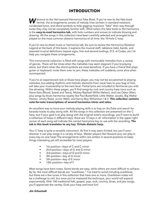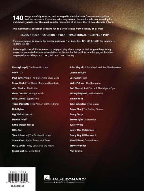 140 songs carefully selected and arranged in the fake book format – melody lines and chord symbols – for the most popular harmonica of all time, the 10-hole diatonic C harp. This monumental collection contains fun to play melodies from a variety of genres: blues, rock, country, folk, traditional, gospel, and pop. They're arranged in several harmonica positions (1st, 2nd, 3rd, 4th, 5th & 12th) for beginners to professional! Each song lists useful information to help you play these songs in their original keys. Many songs contain note-for-note transcriptions of harmonica intros, licks or solos played by blues harp royalty and the pros of pop, folk, rock, and country.