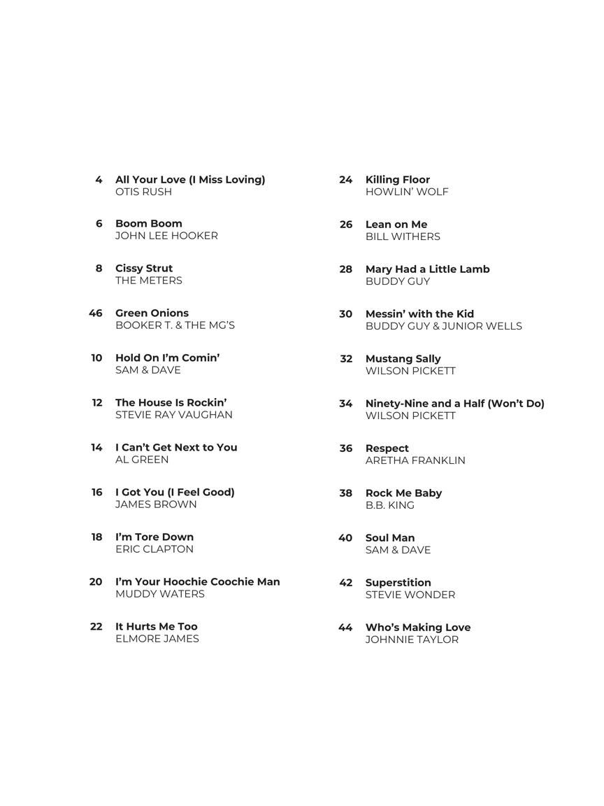 The Really Easy Guitar series makes it incredibly easy to play your favorite songs! This beginner-friendly collection features easy-to-follow chord charts, tablature, and lyrics, allowing you to start playing classic blues and soul songs that have shaped the genre in no time. Songs include: All Your Love (I Miss Loving) • Green Onions • The House Is Rockin' • I Got You (I Feel Good) • I'm Tore Down • Killing Floor • Mustang Sally • Soul Man • Superstition • and more!