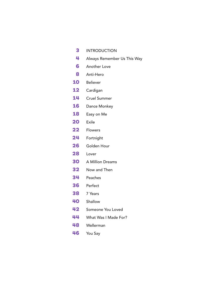 Songs include: Always Remember Us This Way • Another Love • Anti-Hero • Believer • Cardigan • Cruel Summer • Dance Monkey • Easy on Me • Exile • Flowers • Fortnight • Golden Hour • Lover • A Million Dreams • Now and Then • Peaches • Perfect • 7 Years • Shallow • Someone You Loved • Wellerman • What Was I Made For? • You Say.