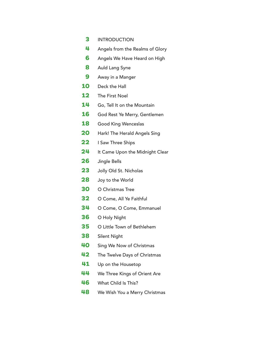 Songs include: Angels from the Realms of Glory • Auld Lang Syne • Deck the Hall • Go, Tell It on the Mountain • It Came Upon the Midnight Clear • Jingle Bells • Joy to the World • O Holy Night • Silent Night • What Child Is This? • and more.