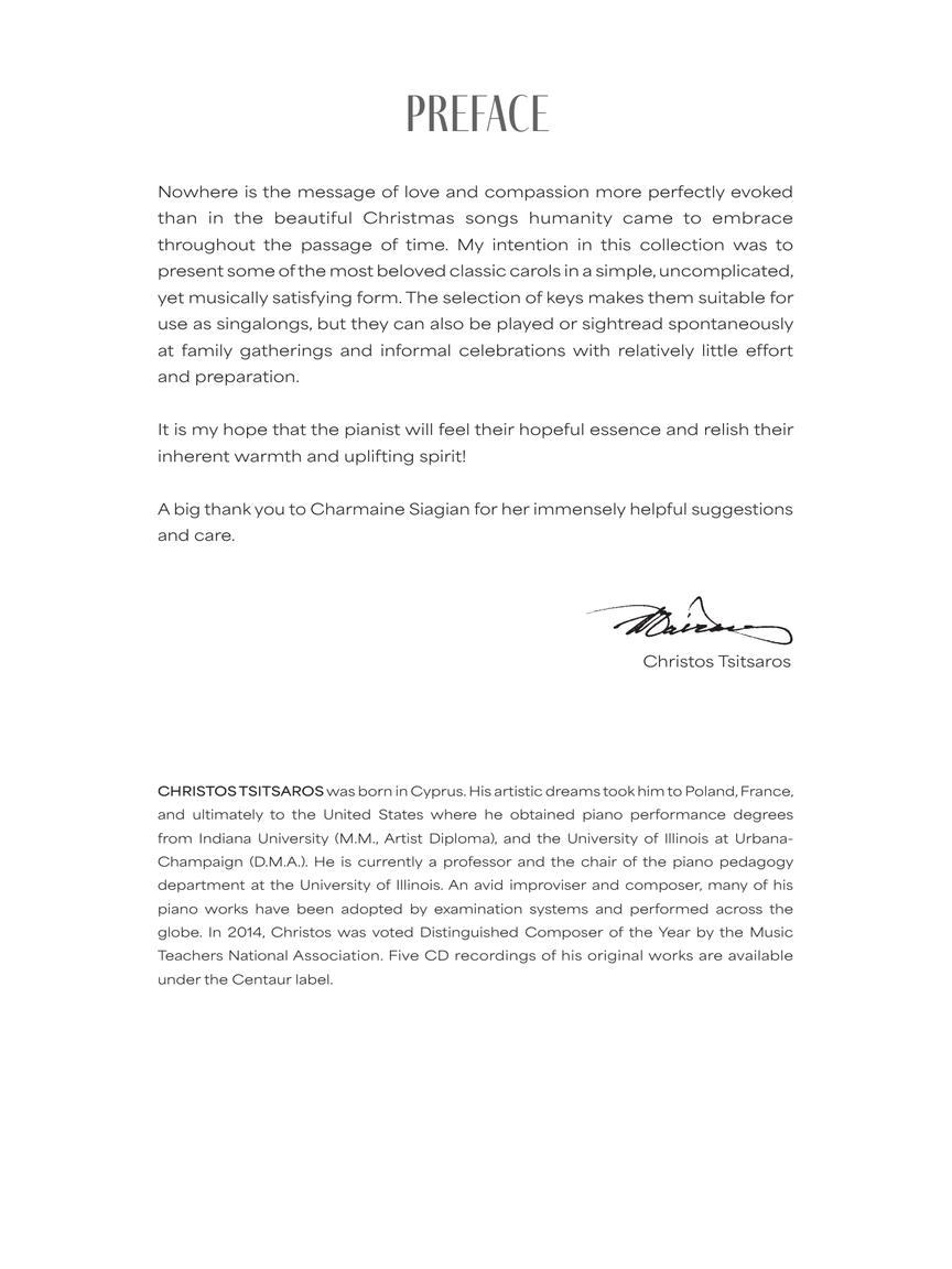 Featuring 24 brief and elegantly arranged carols that can be played at a yearend recital, or sightread and sung by family and friends around the piano at Christmas, these familiar tunes are sure to put you into the holiday mood! These arrangements are mostly at the early intermediate level but do progress slightly in order of difficulty.