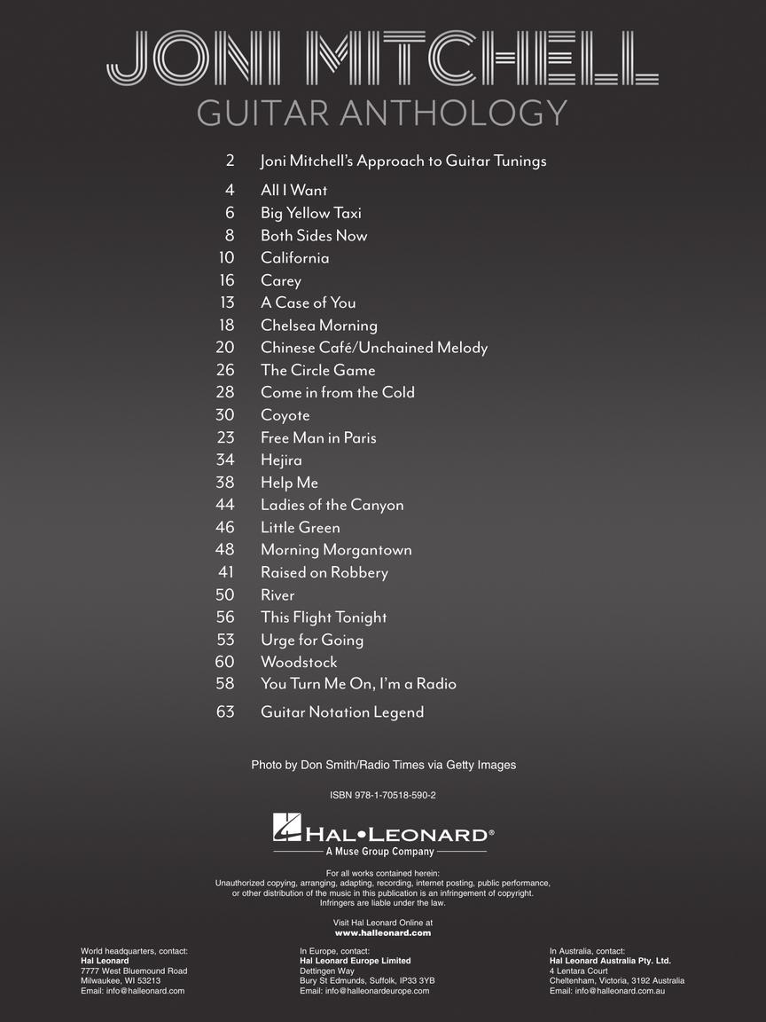 Step into the world of a true music legend with the Joni Mitchell Guitar Anthology. Featuring 23 timeless songs, this collection brings her artistry to life with arrangements for guitar chord symbols, frames, and voice with melody and lyrics. For her most famous strumming patterns and licks, tab notation is included where needed–helping you capture the essence of classics like A Case of You, Both Sides Now, and California.