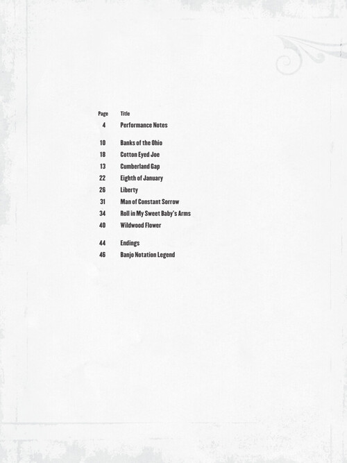 Transcrições para banjo - cifras e tablatura. Acompanha audio online com música completa e play-backs para tocar junto. Banks of the Ohio • Cotton Eyed Joe • Cumberland Gap • Eighth of January • Liberty • Man of Constant Sorrow • Roll in My Sweet Baby's Arms • Wildwood Flower.