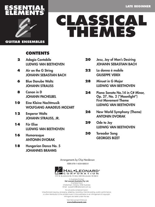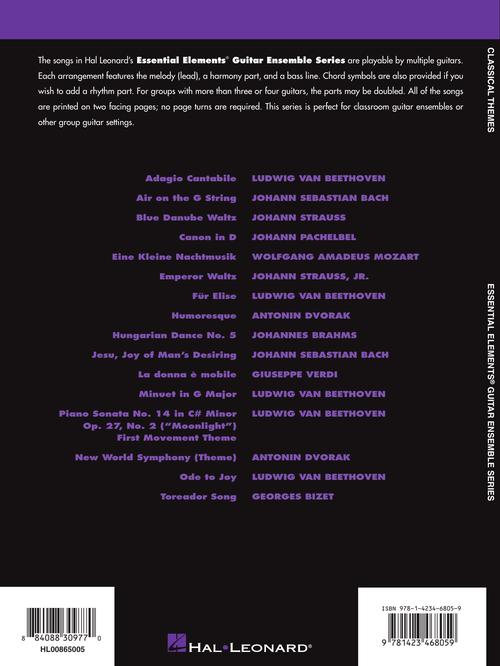 The songs in Hal Leonard's Essential Elements Guitar Ensemble Series are playable by multiple guitars. Each arrangement features the melody (lead), a harmony part, and a bass line. Chord symbols are also provided if you wish to add a rhythm part. For groups with more than three or four guitars, the parts may be doubled. Play all of the parts together, or record some of the parts and play the remaining part along with your recording. All of the songs are printed on two facing pages; no page turns are required. This series is perfect for classroom guitar ensembles or other group guitar settings. This folio includes 16 favorite pieces: Air on the G String (Bach) • Blue Danube Waltz (Strauss) • Canon in D (Pachelbel) • Eine Kleine Nachtmusik (Mozart) • Für Elise (Beethoven) • Jesu, Joy of Man's Desiring (Bach) • New World Symphony (Theme) (Dvorak) • Ode to Joy (Beethoven) • and more.