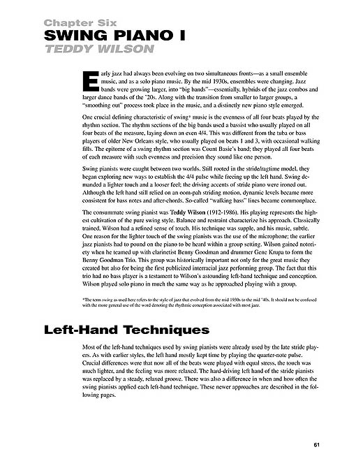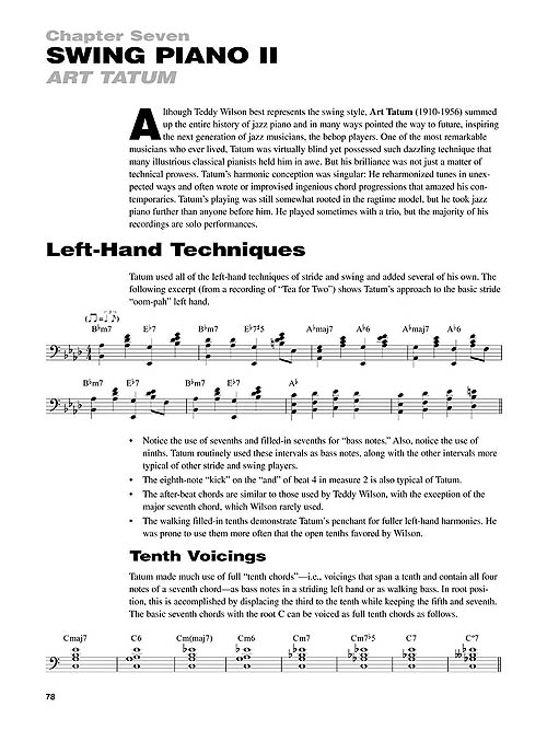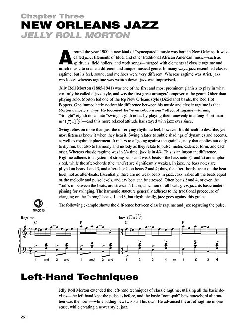 Focados em estilos como Ragtime, Early Blues & Boogie Woogie, New Orleans Jazz, Stride and Swing, este método ensina também técnicas de mão direita e mão esquerda, acordes, linhas de baixo, patterns e muito mais. Aprenda o estilo de pianistas como Scott Joplin, Jimmy Yancey, Pete Johnson, Jelly Roll Morton, James P. Johnson, Fats Waller, Teddy Wilson e Art Tatum. As faixas de áudio estão disponíveis online, juntamente com um player digital multifuncional (Playback+), que permite alterar o andamento sem alterar o tom, definir pontos específicos para tocar (loop), alterar o tom, além de balanço direita/esquerda.