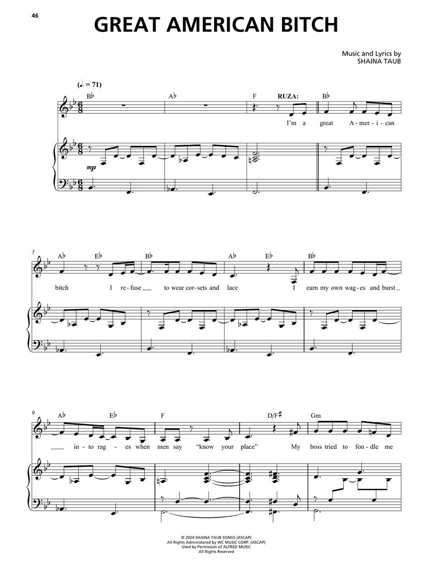 Make your voice heard with our matching songbook, featuring 15 songs from the exuberant score arranged for vocal line with piano accompaniment. Songs include: Finish the Fight • Great American B**** • How Long • If We Were Married • Keep Marching • Let Mother Vote • Lucy's Song • The March (We Demand Equality) • Show Them Who You Are • Wait My Turn • Worth It • and more.