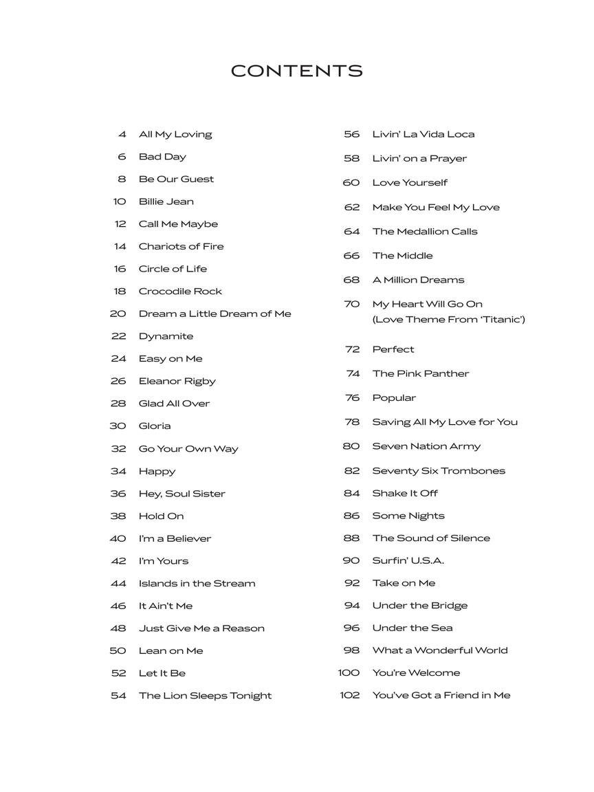 Músicas: All My Loving • Bad Day • Billie Jean • Chariots of Fire • Easy on Me • Glad All Over • Hey, Soul Sister • Livin' La Vida Loca • A Million Dreams • Popular • Shake It Off • Some Nights • You're Welcome • e outras.