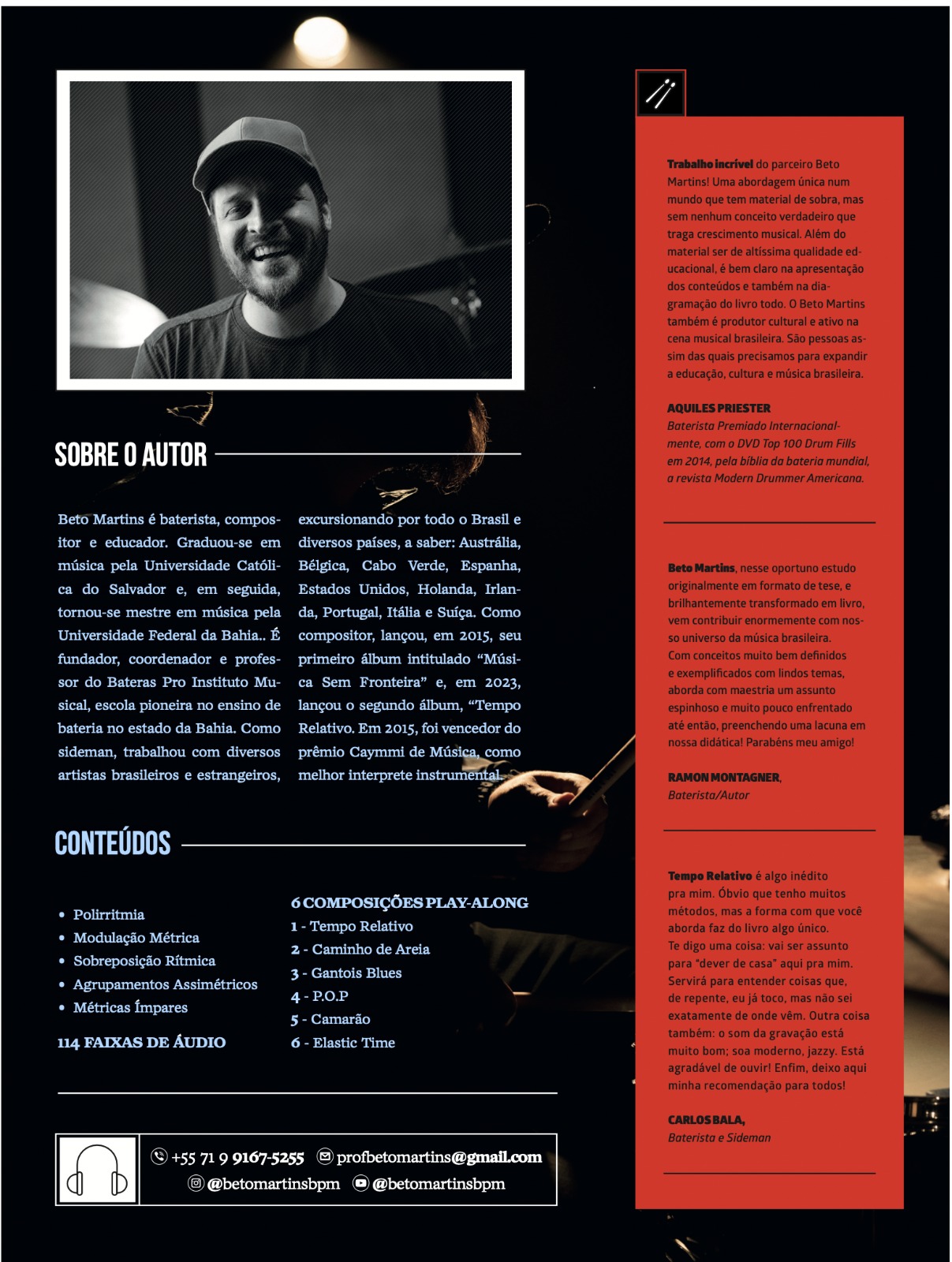 Desenvolvido pelo experiente baterista e educador Beto Martins, Tempo Relativo é um livro único para músicos que desejam explorar técnicas avançadas sobre ritmo, sem abrir mão da expressão artística. Combinando teoria sólida e prática imersiva, a obra inclui faixas de áudio exclusivas em formato play-along (com e sem bateria) para você estudar de forma musical, diretamente no seu instrumento. Polirritmia, Modulação Métrica, Sobreposições e Métricas Ímpares Aplicadas a Bateria.
