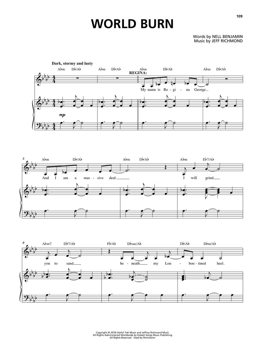 This 2018 Broadway adaptation of the hit 2004 movie about the cut-throat social status of a group of teenage girls features lyrics by Nell Benjamin with music by Jeff Richmond and was nominated for several Tony Awards®. Our folio includes 16 vocal selections: Apex Predator • A Cautionary Tale • Fearless • I See Stars • I'd Rather Be Me • It Roars • Meet the Plastics • More Is Better • Revenge Party • Sexy • Someone Gets Hurt • Stop • Stupid with Love • What's Wrong with Me? • Where Do You Belong? • World Burn.