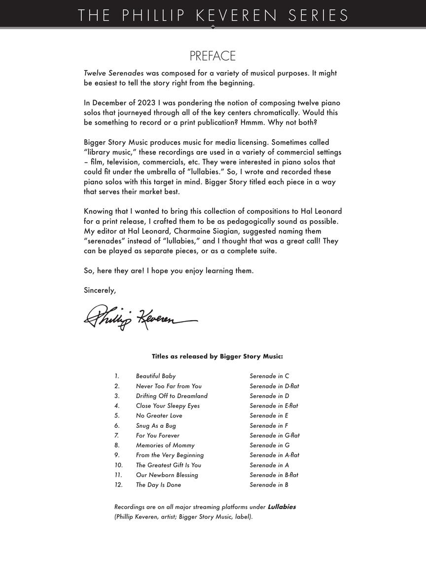 The 12 Serenades are a set of brief evocative piano solos that journey through the twelve key centers chromatically. Written at an intermediate level, these pieces are suitable for reflective playing, or as study pieces for a student. They may be played as separate pieces, or as a whole suite. A recording is available under the title LULLABIES with Bigger Story Music.