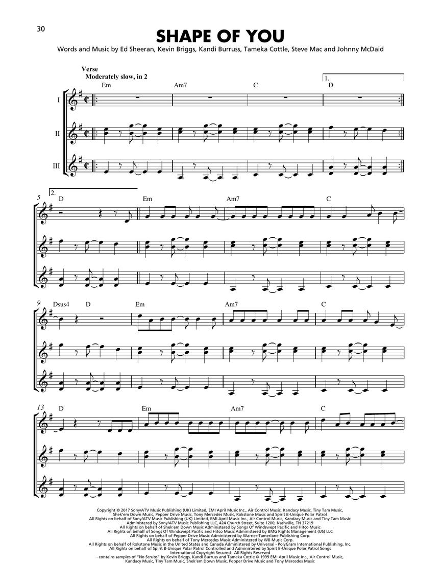 The songs in the Hal Leonard Essential Elements Guitar Ensemble series are playable by multiple guitars. Each arrangement features the melody (lead), a harmony part, and a bass line. Chord symbols are also provided if you wish to add a rhythm part. For groups with more than three or four guitars, the parts may be doubled. All of the songs are printed on two facing pages; no page turns are required. This series is perfect for classroom guitar ensembles or other group guitar settings. This edition features 15 modern hits: All About That Bass • Hey There Delilah • I Will Wait • Rolling in the Deep • Shape of You • Some Nights • Uptown Funk • Viva La Vida • and more.