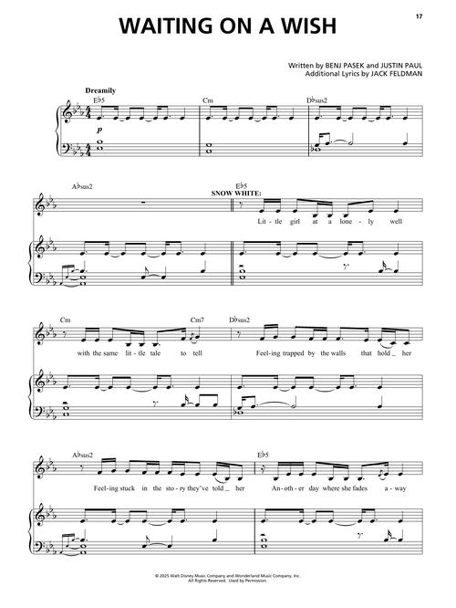 Add a touch of Disney magic to your music shelf with Disney's Snow White! This enchanting collection, arranged for vocal line with piano accompaniment, features eight songs from the beloved tale, including both timeless classics and exciting new additions written by dynamic duo Benj Pasek and Justin Paul. Sing along to iconic favorites like “Heigh-Ho,” “Whistle While You Work,” and “The Silly Song,” or discover new gems composed for the 2025 movie, including “Waiting on a Wish,” “Good Things Grow,” and more.