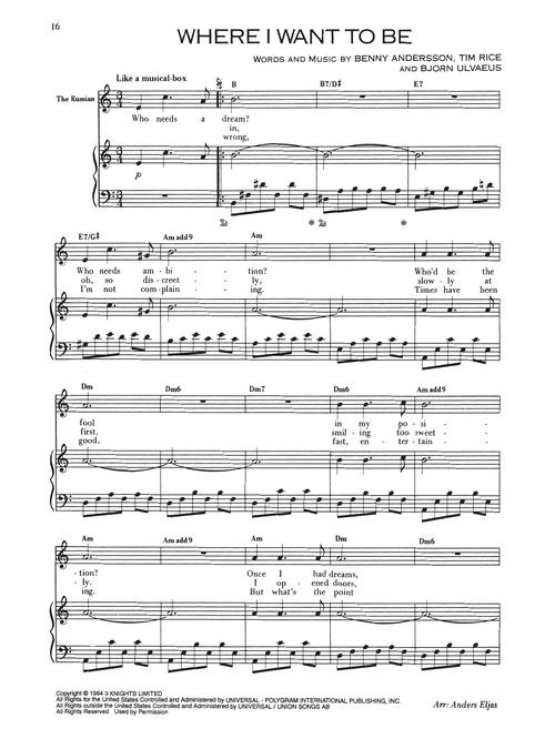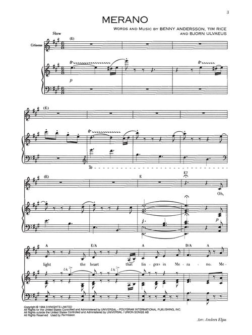 Transcrições para piano/voz, incluindo: Anthem • Chess • Heaven Help My Heart • Merano • One Night in Bangkok • Someone Else's Story • e outras!!!