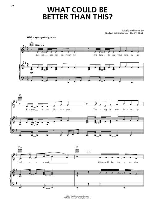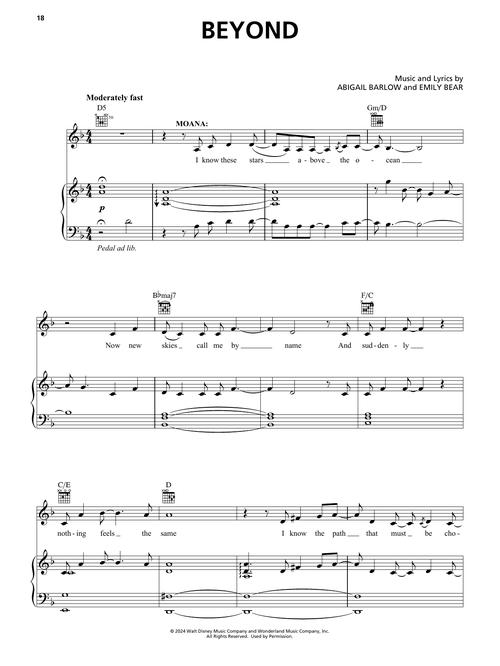 Set sail once again with Disney's Moana 2, where Moana embarks on a bold new adventure to protect her people and the ocean she loves. Our matching folio features 9 original songs by GRAMMY®-winning composers Abigail Barlow & Emily Bear, as well as Opetaia Foa'i and Mark Mancina, beautifully arranged for piano, voice, and guitar chords. From soaring anthems to heartfelt ballads, this collection brings the magic of Moana's latest journey to life for musicians of all levels.