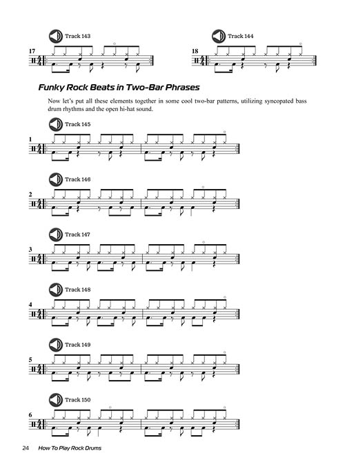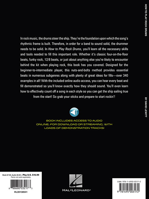 In rock music, the drums steer the ship. They're the foundation upon which the song's rhythmic frame is built. Therefore, in order for a band to sound solid, the drummer needs to be solid. In How to Play Rock Drums, you'll learn all the necessary skills and tools needed to fill this important role. Whether it's classic four-on-the-floor beats, funky rock, 12/8 beats, or just about anything else you're likely to encounter behind the kit when playing rock, this book has you covered. Designed for the beginner-to-intermediate player, this nuts-and-bolts method provides essential beats in numerous subgenres along with plenty of great ideas for fills – over 340 examples in all! With the included online audio access, you can hear every beat and fill demonstrated so you'll know exactly how they should sound. You'll even learn how to effectively count off a song in each style so you can get the ship sailing true from the start! So grab your sticks and prepare to start rockin'!