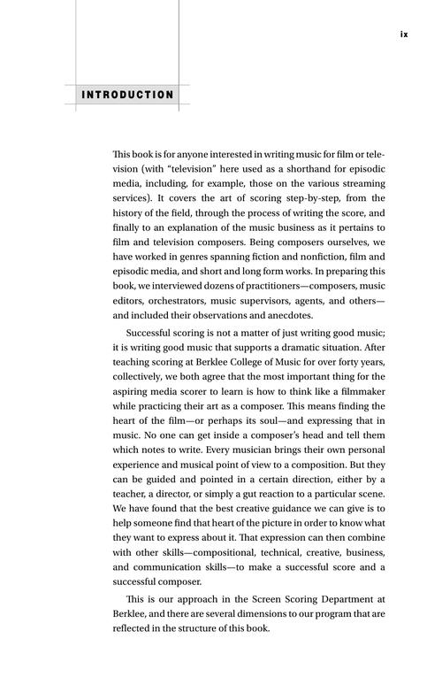 Learn the business, process, and procedures of writing music for film, television, and other forms of media. This book goes step-by-step through the Berklee approach to the art of film scoring. In tracing the evolution of film music from its early silent film origins to today's contemporary practices, you will understand the conventions of the medium and gain a solid grounding for how to approach creating your own evocative scores. Read insights from many of today's film music professionals: composers, orchestrators, music editors, and others – providing an up-to-date account of the art and business of including music in film. Now in its third edition, this comprehensive guide has long been core to Berklee's world-renowned Screen Scoring Department curriculum, whose graduates are scoring films in Hollywood and for film studios worldwide.