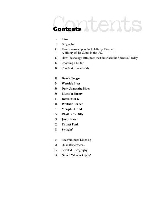 Master musician Duke Robillard provides fans and fellow guitarists an inside look at the techniques and philosophy behind his classic American guitar style. This book/audio pack includes: 11 complete songs; more than 25 photos; tips on choosing a guitar and getting a great sound; country blues chords, modern electric blues chords and swing blues/jazz chords; jazzy turnarounds, jazz/blues accompaniment; and much more! The audio contains original music recorded by Duke exclusively for this project, and the book includes a biography, selected discography, recommended listening list and tablature.