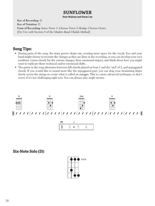 The modern band songbooks are designed to supplement the corresponding modern band method books, but they can also be used with any beginner instrument method. The ukulele edition aligns with the other songbooks for keyboard, bass, drums, and guitar, making full-band collaboration easy and fun! Designed to get players band-ready fast, this book includes lyrics, chords, rhythm patterns, signature riffs, tab/notation, as well as tips for improvisation and soloing.