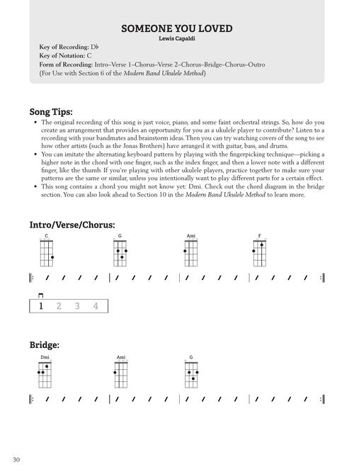 Modern Band Method Songbooks foram projetados para complementar os livros correspondentes de métodos para bandas modernas, mas também podem ser usados com qualquer método instrumental para iniciantes. A edição para ukulele se alinha aos outros songbooks para teclado, baixo, bateria e violão, tornando a colaboração com toda a banda fácil e divertida! Projetado para preparar os músicos para a banda rapidamente, este livro inclui letras, acordes, padrões rítmicos, riffs característicos, tablatura/notação, além de dicas para improvisação e solos. Incluindo: Adore You • Dreams • Dynamite • Echame La Culpa • Goodbye Looks Good on You • Halo • Ojitos Lindos • Someone You Loved • Sunflower • What About Us • e outras!!!