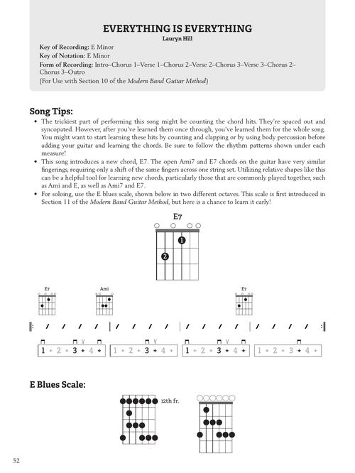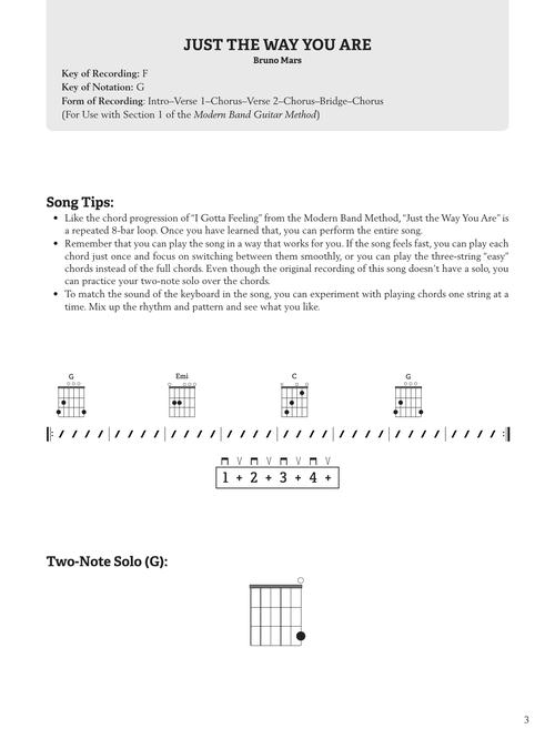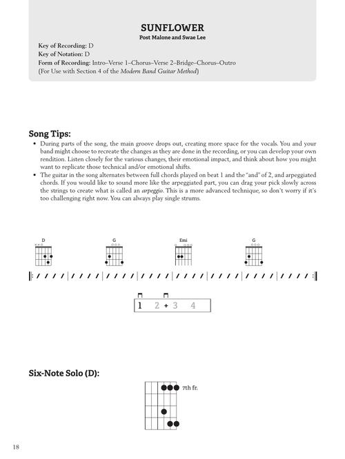 The modern band songbooks are designed to supplement the corresponding modern band method books, but they can also be used with any beginner instrument method. The guitar edition aligns with the other songbooks for keyboard, bass, drums, and ukulele, making full-band collaboration easy and fun! Designed to get players band-ready fast, this book includes lyrics, chords, rhythm patterns, signature riffs, tab/notation, as well as tips for improvisation and soloing.