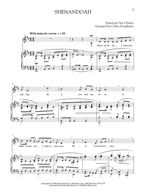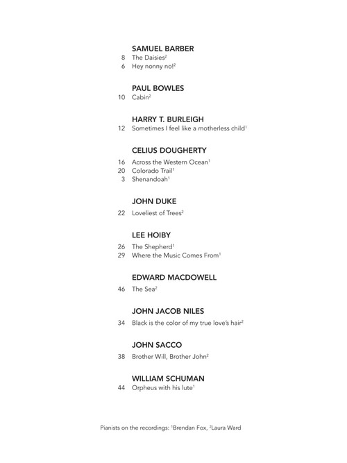 SAMUEL BARBER: The Daisies • SAMUEL BARBER: Hey nonny no! • PAUL BOWLES: Cabin • HARRY T. BURLEIGH: Sometimes I feel like a motherless child • CELIUS DOUGHERTY: Across the Western Ocean • CELIUS DOUGHERTY: Colorado Trail • CELIUS DOUGHERTY: Shenandoah • JOHN DUKE: Loveliest of Trees • LEE HOIBY: The Shepherd • LEE HOIBY: Where the Music Comes From • EDWARD MACDOWELL: The Sea • JOHN JACOB NILES: Black is the color of my true love's hair • JOHN SACCO: Brother Will, Brother John • WILLIAM SCHUMAN: Orpheus with his lute