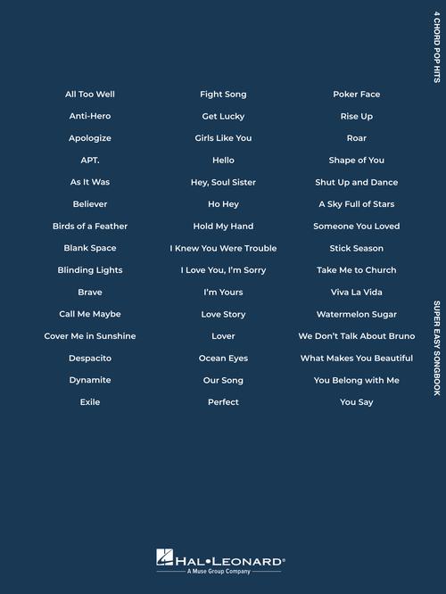 This must-have collection features 45 of today's top hits that each use only four chords! Songs include: All Too Well • Apologize • Apt. • Birds of a Feather • Blinding Lights • Brave • Despacito • Fight Song • Get Lucky • Hello • Hey, Soul Sister • Ho Hey • I Love You, I'm Sorry • I'm Yours • Love Story • Perfect • Poker Face • Shape of You • Shut up and Dance • Someone You Loved • Stick Season • Take Me to Church • Viva La Vida • Watermelon Sugar • What Makes You Beautiful • You Say • and more.