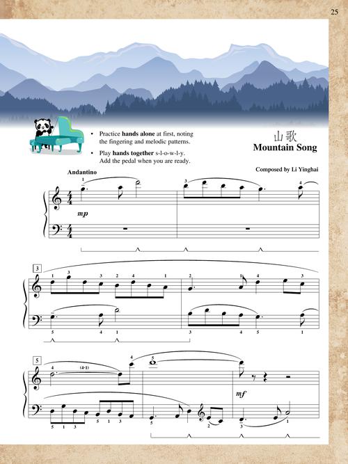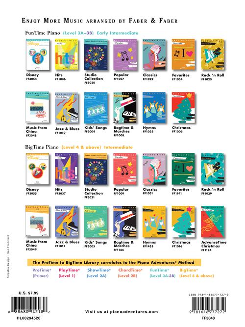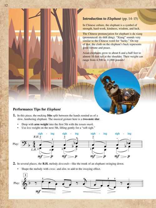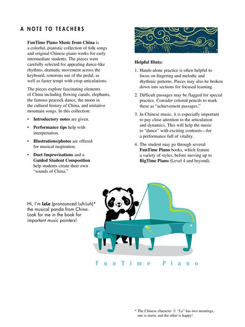 FunTime Piano Music from China is a special collection of folk songs and original Chinese works arranged for early intermediate students (Level 3A-3B). These pieces offer dance-like rhythms, dramatic movement across the keyboard, sonorous use of the pedal, and fast tempi with crisp articulations. Music and text explore fascinating aspects of China such as flowing canals, majestic elephants, peacock dances, mooncakes, and mountain songs. The delightful character LeLe the panda lends a paw with questions for interpretation, and students create their own Chinese sounds in improvisation and composition activities.
