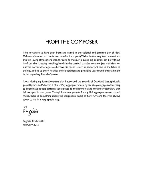 As a native of New Orleans, Eugénie Rocherolle grew up immersed in the unique musical sounds of this beautiful historic city, also known as the Big Easy. As a result, each piano solo in this collection evokes an elegant, nostalgic charm. Titles: Big Easy Blues • Bourbon Street Beat • Carnival Capers • Jivin' in Jackson Square • Masquerade! • Rex Parade.