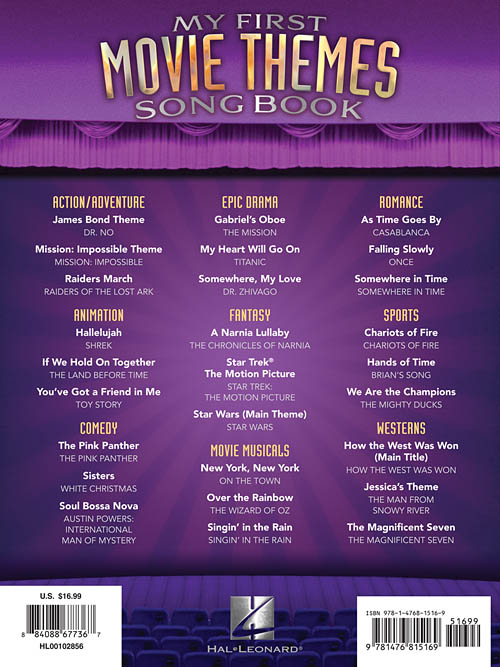 A keepsake collection of nearly 30 favorite movie themes, all arranged for easy piano and presented with beautiful full-color illustrations! Highlights include: As Time Goes By • Chariots of Fire • Hallelujah • James Bond Theme • Mission: Impossible Theme • My Heart Will Go On • Over the Rainbow • The Pink Panther • Raiders March • Singin' in the Rain • Somewhere My Love • Star Wars (Main Theme) • You've Got a Friend in Me • and more.