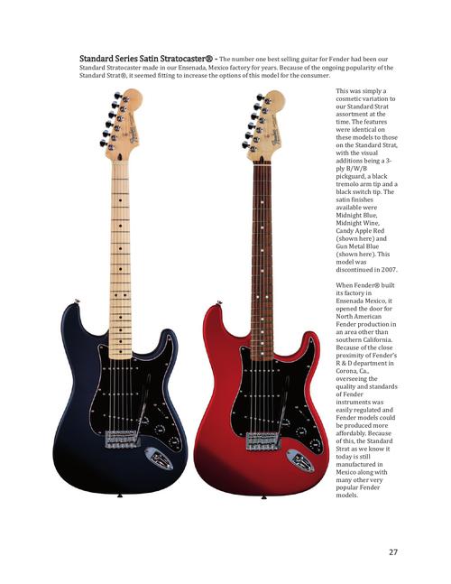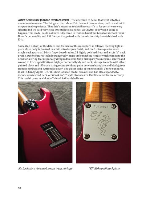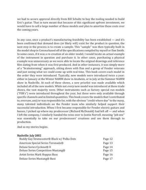 This book takes the reader inside of the company, the factories, the processes, and the thinking, in building the brand name and tradition that Leo Fender started in 1946. A behind-the-scenes look at manufacturing and release of Fender Electric Guitars and Basses between the years 2002-2006, written by the person responsible for bringing these instruments to market at that time. The book features the what, why, where and when of 115 price list models released between 2002-2006 shown and explained in detail with beautiful colorful pictures. The detailed specs and facts behind each model are also included. There are also 30 models, many of which have never been seen before, described as the book concludes.