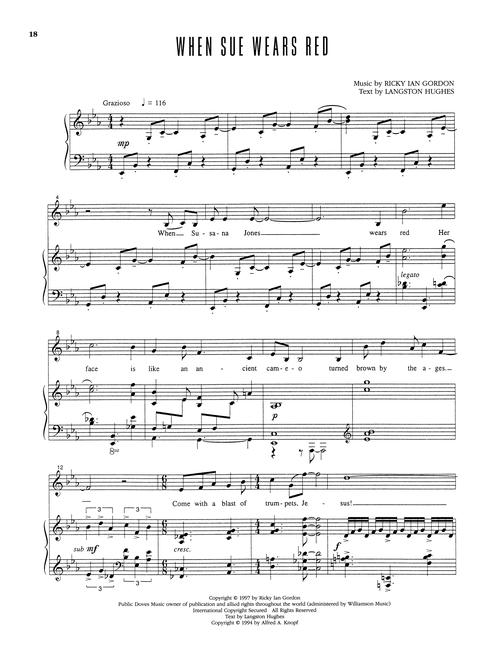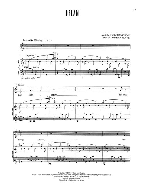 Settings of 17 poems by Langston Hughes. Contents: Angel Wings • Daybreak in Alabama • Delinquent • Demand • Dream • Dream Variations • Drum • Harlem Night Song • In Time of Silver Rain • Late Last Night • Litany Luck • Night: Four Songs • Port Town • Song for a Dark Girl • Stars • When Sue Wears Red.