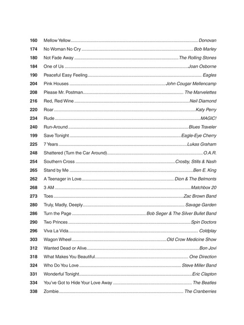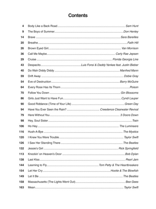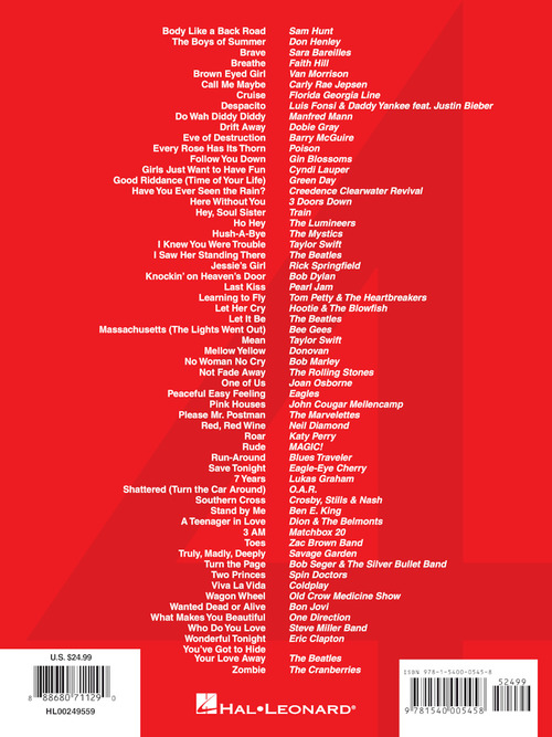 60 favorite songs that span several genres and feature only four chords, making them easy to learn to play, are featured in this collection for piano, voice and guitar. Songs include: Brown Eyed Girl • Cruise • Despacito • Every Rose Has Its Thorn • Good Riddance (Time of Your Life) • Ho Hey • I Knew You Were Trouble • Jessie's Girl • Let It Be • Mellow Yellow • Not Fade Away • Peaceful Easy Feeling • Roar • 7 Years • Stand by Me • Toes • Viva La Vida • Wagon Wheel • Wonderful Tonight • and more.