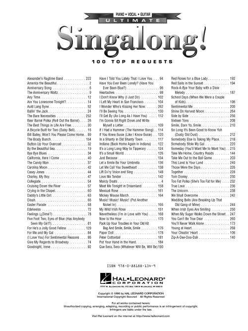 This book provides hours of singalong fun around the piano! Songs include: Alexander's Ragtime Band • Auld Lang Syne • Beer Barrel Polka (Roll Out the Barrel) • Bill Bailey, Won't You Please Come Home • The Brady Bunch • Easter Parade • Edelweiss • Feelings • Give My Regards to Broadway • I Left My Heart in San Francisco • If You Knew Susie (Like I Know Susie) • It's a Small World • Love Me Tender • Sixteen Tons • Take Me Home, Country Roads • When Irish Eyes Are Smiling • Zip-A-Dee-Doo-Dah • and more.