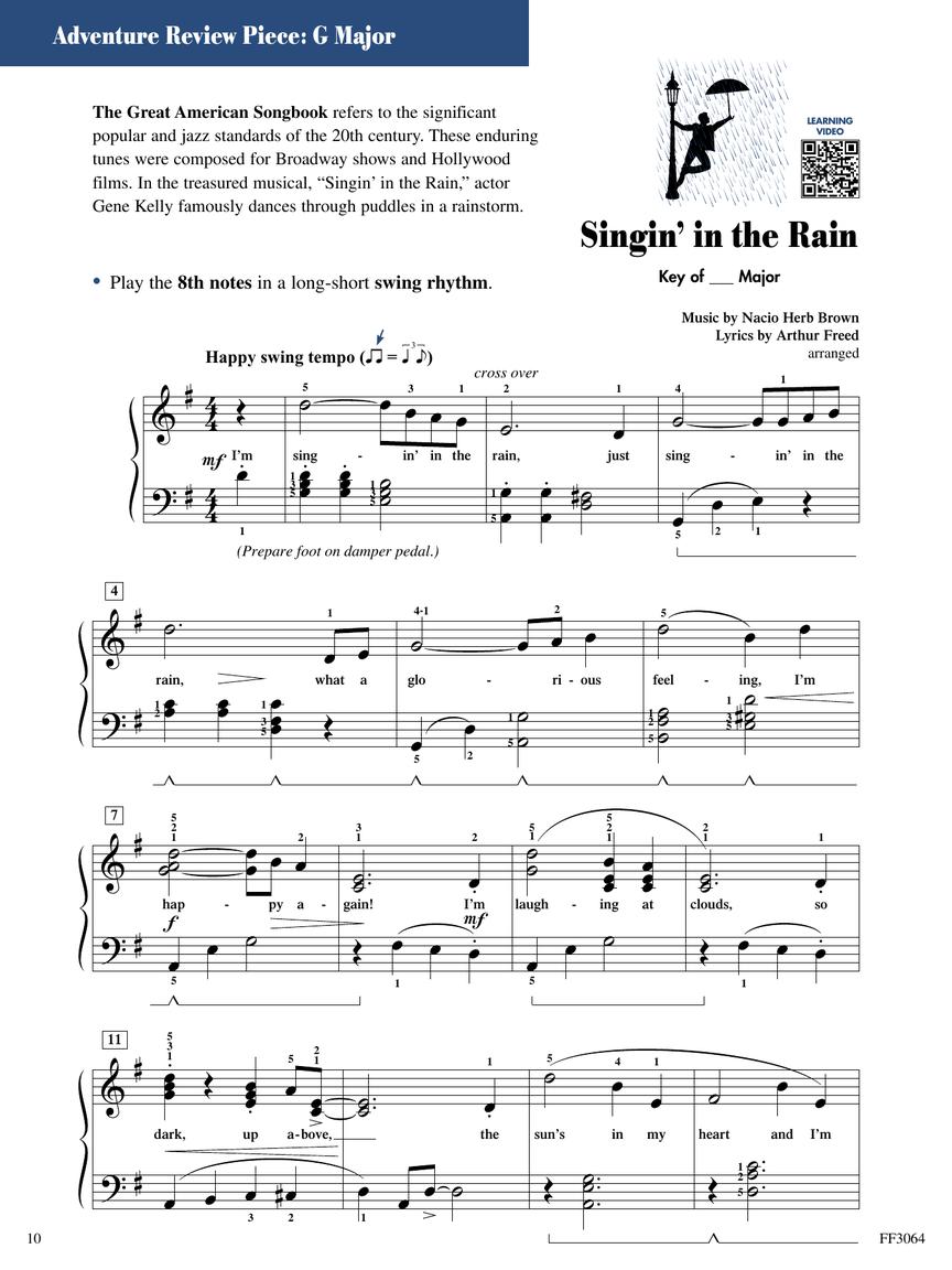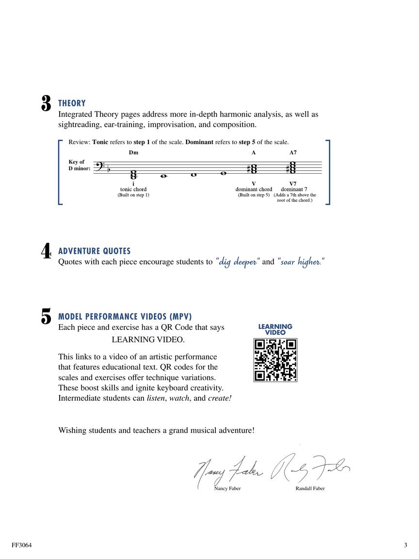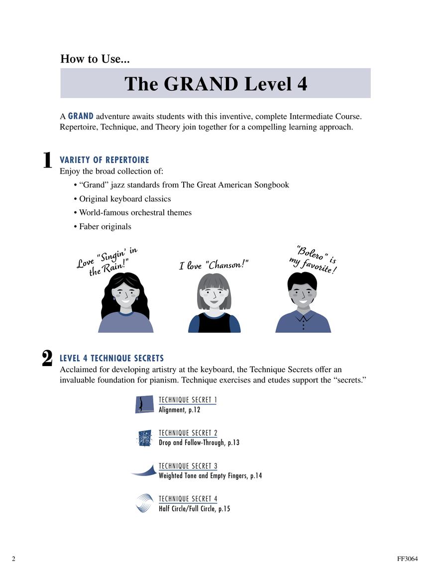 A GRAND adventure awaits! This inventive, all-in-one intermediate course combines Lessons, Technique, Theory, and Performance into a single volume, complete with digital support. New arrangements of jazz standards and world-famous orchestral themes join time-tested keyboard classics and Faber originals. Acclaimed Technique Secrets and exercises develop artistry and pianism, while integrated Theory activities build skills in harmonic analysis, sightreading, ear-training, and improvisation. QR codes provide instant access to Model Performance Videos, offering expressive demonstrations and instructive commentary. Get ready to embark on a comprehensive musical journey!