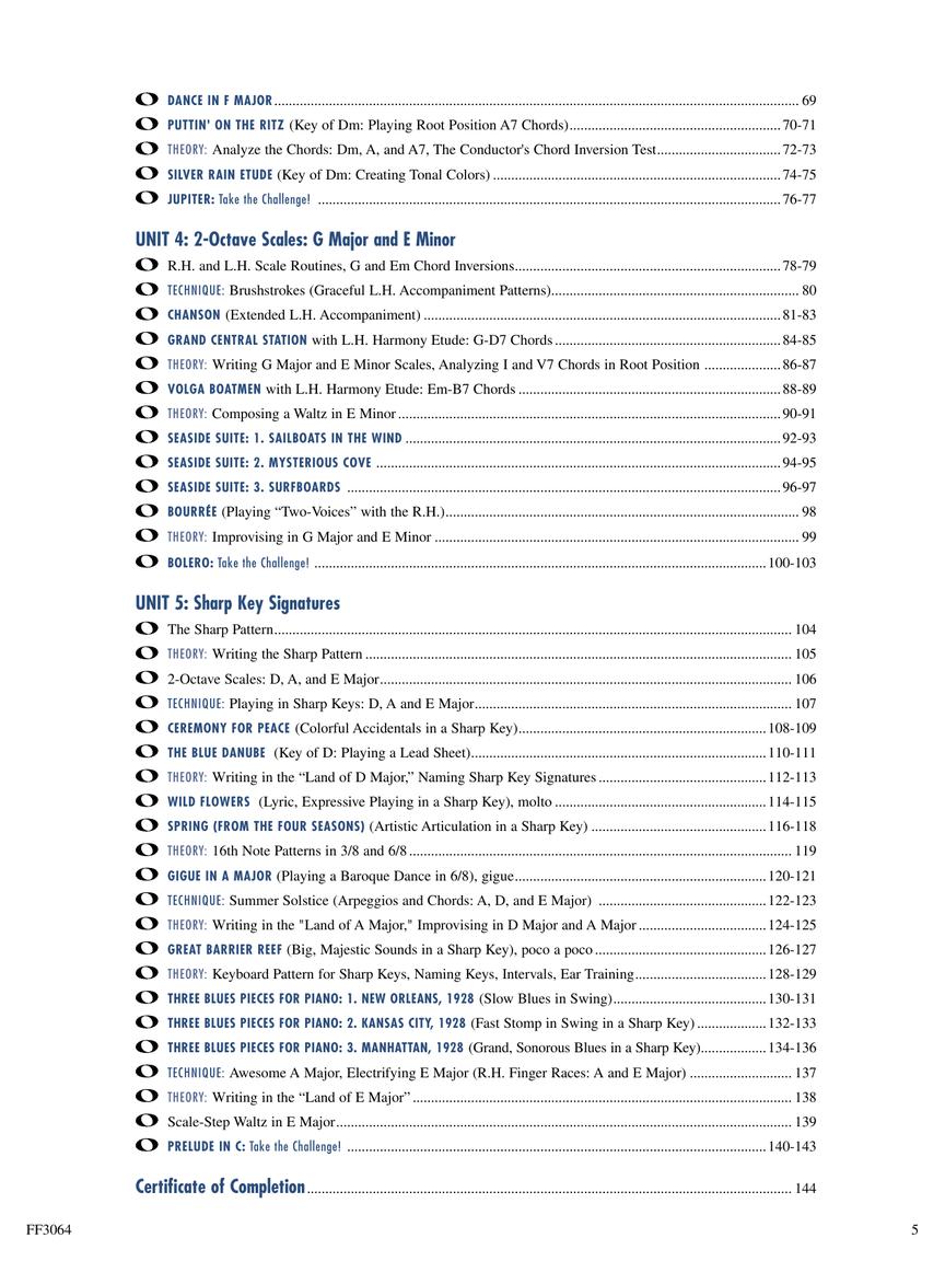 Songs include: Ain't Misbehavin' • Allegro Grazioso (Biehl) • Arabesque (Burgmüller) • Aria: Bist Du Bei Mir (J.S. Bach) • Aurora Borealis • The Blue Danube • Bolero (Ravel) • Bourrée (Graupner) • Ceremony for Peace • Chanson • Dance in F Major (Mozart) • Distant Bells • Excalibur • French Minuet • Gigue in A Major • Grand Central Station • Great Barrier Reef • In the Hall of the Mountain King (Grieg) • Jupiter (Holst) • Maple Leaf Rag • Mazurka in F Major • Medieval Fair • Moonlight Sonata (Beethoven) • Passacaglia (Handel) • Prelude in C (J.S. Bach) • Puttin' on the Ritz • Seaside Suite: 1. Sailboats in the Wind • Seaside Suite: 2. Mysterious Cove • Seaside Suite: 3. Surfboards • Silver Rain Etude • Singin' in the Rain • Sonatina in C (Lynes) • Spring (from The Four Seasons) • The Spy • Three Blues Pieces for Piano: 1. New Orleans, 1928 • Three Blues Pieces for Piano: 2. Kansas City, 1928 • Three Blues Pieces for Piano: 3. Manhattan, 128 • Volga Boatmen • Wild Flowers.