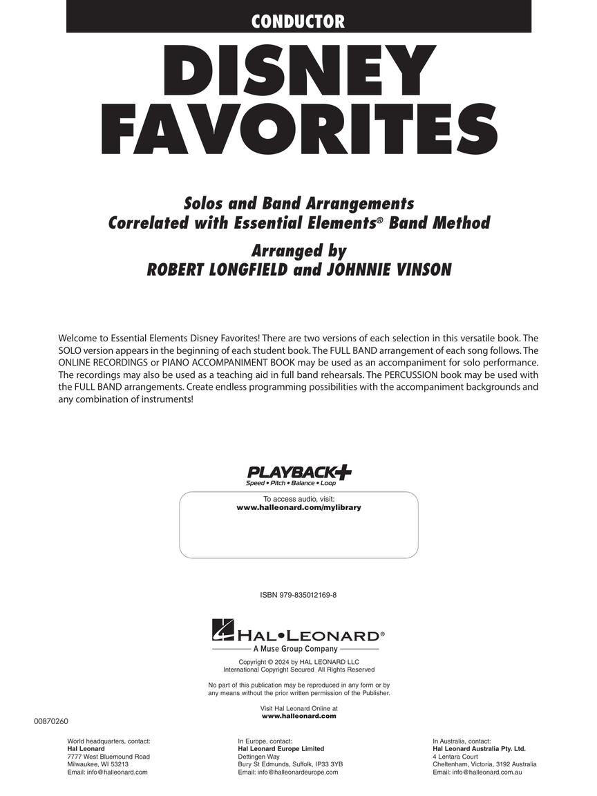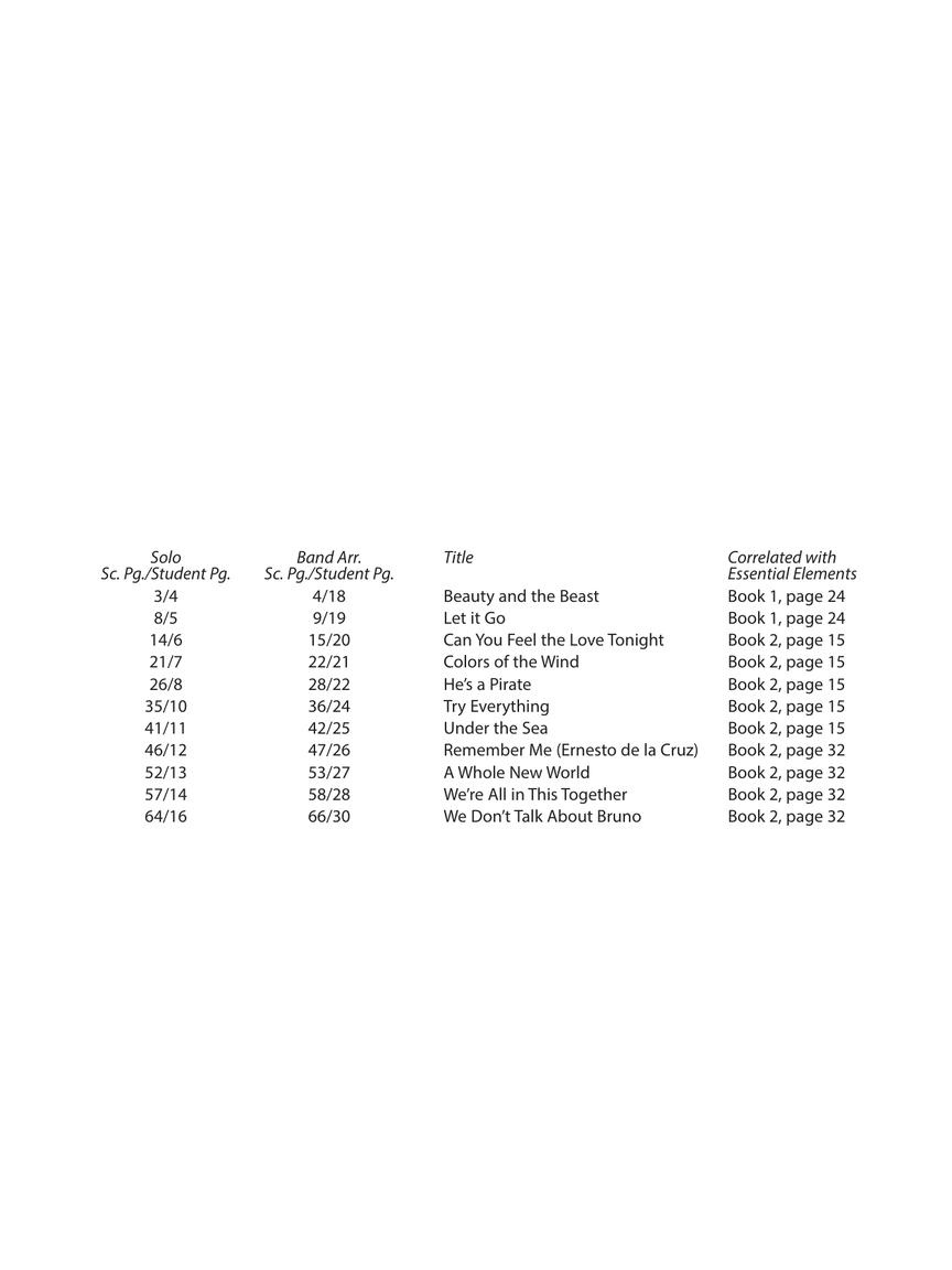 There's no better way to motivate your band than with some popular Disney music! This new collection from Essential Elements works with all ensembles, regardless of what method you're using, and features great songs your band members are sure to know. The arrangements work for the whole ensemble to play together, but also as solo works for each instrumentalist! The songs are carefully correlated to correspond with instruction in the Essential Elements method books 1 and 2 so you'll know exactly when your group is ready to take on another song. A handy chart is provided in the table of contents so you can see the progress requirements.