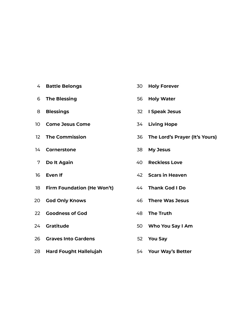 This collection features 28 simple arrangements for piano of top Christian hits by artists including Lauren Daigle, Elevation Worship, Forrest Frank, and more! Super Easy arrangements feature no page turns, simple right-hand melody, letter names inside each note, and basic left-hand chord diagrams. Songs include: Battle Belongs • The Blessing • Blessings • Come Jesus Come • The Commission • Cornerstone • Do It Again • Even If • Firm Foundation (He Won't) • God Only Knows • Goodness of God • Gratitude • Graves into Gardens • Hard Fought Hallelujah • Holy Forever • Holy Water • I Speak Jesus • Living Hope • The Lord's Prayer (It's Yours) • My Jesus • Reckless Love • Scars in Heaven • Thank God I Do • There Was Jesus • The Truth • Who You Say I Am • You Say • Your Way's Better.