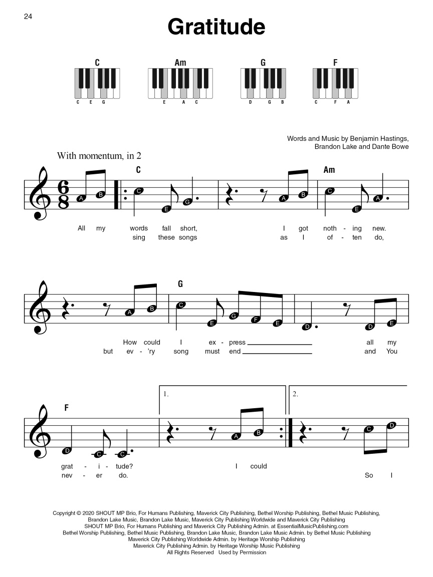 This collection features 28 simple arrangements for piano of top Christian hits by artists including Lauren Daigle, Elevation Worship, Forrest Frank, and more! Super Easy arrangements feature no page turns, simple right-hand melody, letter names inside each note, and basic left-hand chord diagrams.